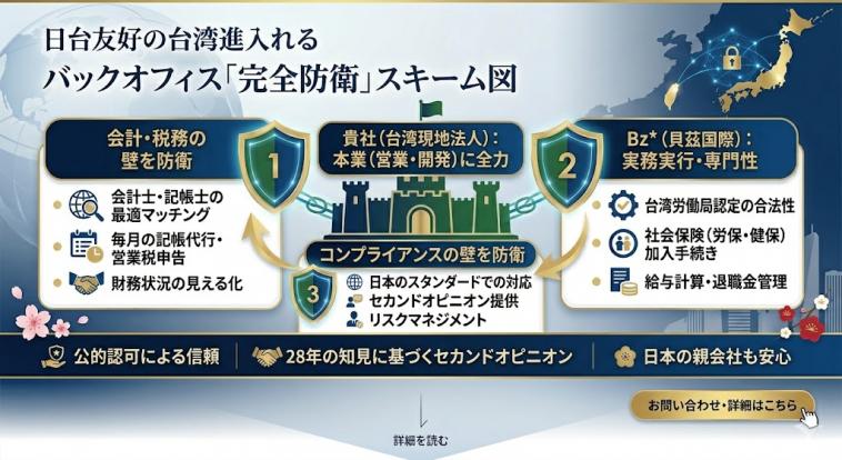 「通訳」ではなく「翻訳者」としての介在: 専門用語の通訳だけでは、経営判断を誤ります。弊社は台湾の法律と日本の常識のギャップを埋める「翻訳者」として、実務の現場を調整し続けます。トラブルが発生した際、会計士に直接言いづらいことも、弊社が貴社の立場に立って交渉・解決します。