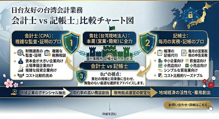 台湾には「会計士」と「記帳士」の2種類があり、企業の規模や業種によって選定を誤ると、余計なコストが発生します。