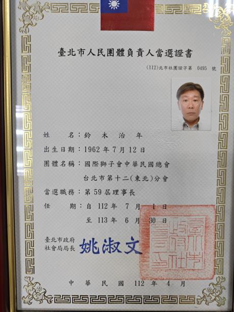 2024-2025年度:国際ライオンズクラブ 複合地区 議長副発言人 就任 現在、より広域な地区において日台交流の要職を務めました。