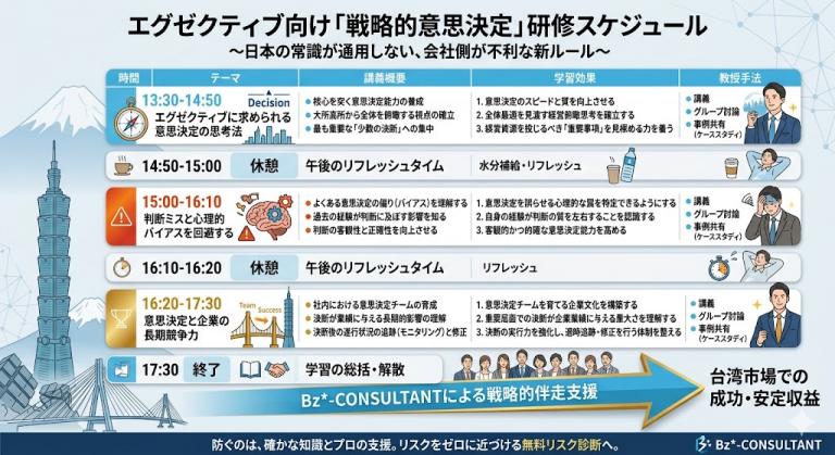 弊社が提供するのは、一過性の講演ではなく、「貴社の台湾拠点を、本社をもしのぐ最強の精鋭部隊に変える」という約束です。